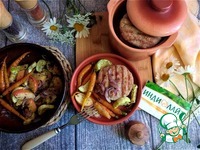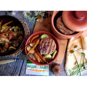 Пока займёмся овощами. Готовим овощи. Мелкую морковку намоем, отрежем длинные хвостики и ботву. Ботвы оставьте ~1 см. Кабачок нарежем полу-дольками и добавим оставшуюся половинку сладкого яблока, тоже порезанную пластинками. Лук нарежем перьями, а чеснок просто почистим. Выкладываем в плошку для запекания. Солим, перчим, добавляем приправу (итальянские травы), наливаем масло и всё аккуратно перемешиваем так, чтобы все составляющие обволоклись масляно-пряной смесью. Ставим в духовку, если она есть на даче. Можно овощи запечь в фольге на мангале в углях, хорошо их завернув. |