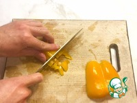 У болгарского перца вырезаем плодоножку и мякоть нарезаем небольшим кубиком. |