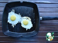 На этом же гриле обжариваю яйца, не нарушая целостность желтка. Присыпаю яичницу глазунью щепоткой соли и свежемолотым перцем. |