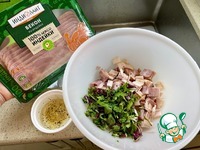 Измельчим бекон из индейки «Индилайт» и салатный микс. Стараемся, чтобы кусочки получались примерно одинакового размера. Заправим нашу начинку маслом и перцем и чесноком. Перемешаем. |