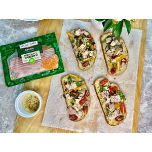 Описание: Яркая и эффектная закуска на ароматном поджаренном хлебе с россыпью ярких помидоров черри и беконом из индейки «Индилайт» превратит ваш пикник в настоящий Брускетта-фест!