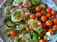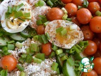 В глубокую тарелку выложить творог, филе, яйцо, огурец, черри. |