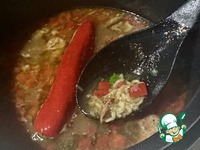 За 10 — 15 минут до окончания варки положить толчёный чеснок, мелко нарезанную зелень кинзы, стручковый и чёрный перец (истолчённый), соус ткемали или винный уксус (по желанию) и соль.
