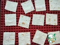 Лаваш нарезаем на квадраты около 5 см. И отправляем в разогретую до 200* духовку, немного их подсушиваем (это происходит очень быстро, не упустите момент). |