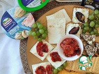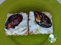 Тем временем намазываем творожный сыр на крекеры, сверху выкладываем вяленые сливы, поливаем маслом. |