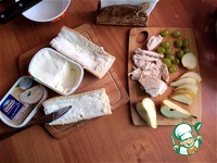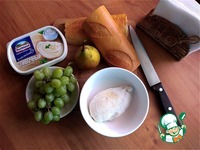 Укладываем на одну половинку багета порезанную грушу, кусочки куриной грудки столько, сколько поместится. Чередуйте слои курицей и грушей. Укладываем виноград. |