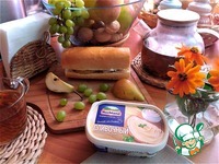 Накрываем верх второй половинкой промазанного сыром багета, это если вы захотите сделать сэндвич. Все составляющие сэндвича отлично прилипнут к сыру и сэндвич не развалится. |
