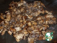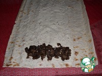 Затем на край лаваша выкладываем половину обжаренных грибов. |