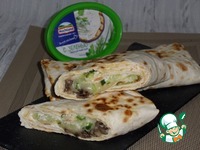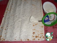 На лаваш выкладываем 1 ч. л. с горкой творожного сыра с зеленью ТМ "Hochland " и равномерно распределяем его в центральной части лаваша. |