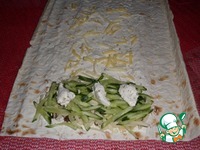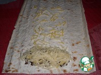 Поверх грибов добавляем натертый полутвердый сыр. Также немного натертого сыра распределяем по поверхности лаваша. |