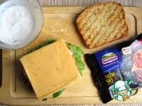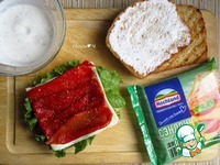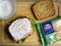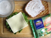 Ломтики хлеба смажьте соусом. На нижний хлебный ломтик положите лист салата, затем ломтик сыра "Сэндвич". |