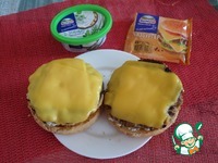 Затем на булочку выкладываем куриные котлеты с ломтиками плавленного сыра. |