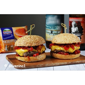 Половинки булочек смазать соусом чили. На нижнюю часть выложить половину жареных овощей. Сверху разложить котлеты с сыром. Поверх них выложить оставшуюся часть жареной овощной смеси. |