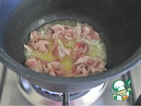 В казане растопить сливочное масло, в котором обжарить около 5 минут кусочки бекона. |