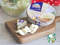 Ломтики сливочного плавленого сыра ТМ Hochland освободить от фольги, нарезать небольшими кусочками, добавить в чашку с капустной начинкой. |