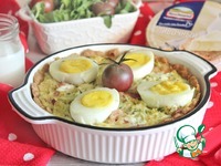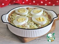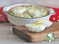 Поверх начинки разложить половинки яиц срезом вверх. |