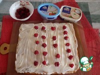 Медовый корж раскручиваем. Выкладываем на корж приготовленный крем, отложив 1 ст. л., и равномерно распределяем. Выкладываем поверх крема 100 гр малины. |