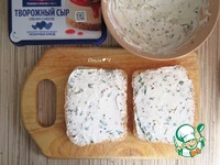 Смажьте творожной массой ломтики хлеба, два с верхней стороны, два с нижней. |