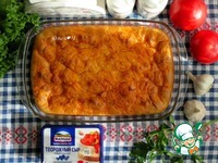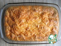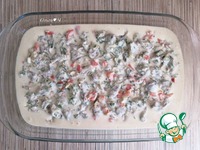 Форму для запекания (у меня 28х19 см) смажьте маслом, вылейте примерно половину жидкого теста. Добавьте начинку. |