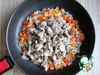 Добавьте куриные желудочки, обжарьте вместе. |