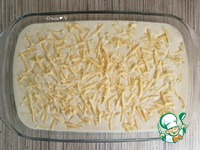 Залейте оставшимся тестом. Посыпьте тертым сыром. |