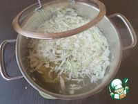 Параллельно ставим воду на плиту, как только она закипит, добавляем нашинкованную капусту и картофель, сразу солим. |