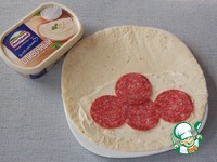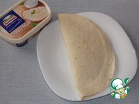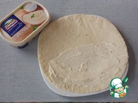 Смазать плавленым сыром (Т. М. Хохланд) одну половину лепешки, немного отступив от краев. |