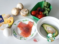 А в холодильнике, кроме сыра, нашлось: - половинка авокадо; - варёное яйцо; - ломтик слабосолёной рыбы; - несколько помидорок черри; - веточка зелени; - три шампиньона; - зубчик чеснока. |