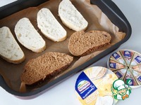 Режем хлеб. На каждый ломтик кладём кусочек сыра, разрезанного пополам. Можно хлебушек сбрызнуть оливковым маслом. Отправляем в духовку на 5-7 минут при 200 градусах. |