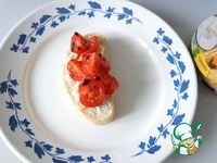 На кусочки хлеба с треугольничками "4 сыра" кладём помидорную смесь. |