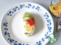 На хлеб с сыром со вкусом "Сливочный" выкладываем авокадо, кружочек яйца и кусочек рыбы. |