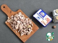 1. У меня была уже готовая отварная голень индейки. Вы можете отварить голень с добавлением лука и моркови в подсоленной воде до мягкости мяса. Затем охладите, снимите мякоть и нарежьте кусочками. |