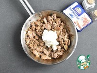 5. Добавьте нарезанное мясо индейки. Добавьте немного мускатного ореха, достаточно пару раз провести по терке. Прогрейте пару минут. |