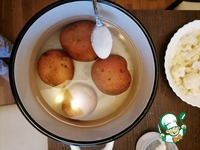 Подготовьте ингридиенты для приготовления пюре. Картофель вымойте, залейте холодной водой в кастрюле и добавьте 1 ч. л. соли. После закипания варите 35 минут. |