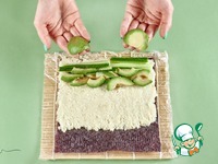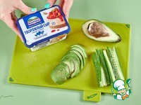 За это время как раз приготовится начинка. Огурцы нарезать соломкой, половинку авокадо пластинками. |