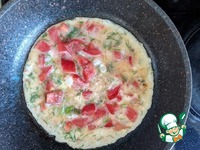 На горячую сковороду наливаем остатки масла. Выливаем яичную смесь, готовим на среднем огне до готовности, около 5 минут, под закрытой крышкой. |