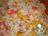 К батону добавить кукурузу и порубленные крабовые палочки. Все это тщательно перемешать. |