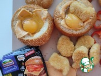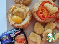 Вставляем куриный наггетсы. Если у вас крупные булочки, то можно пару кусочков. |