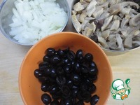 Для начинки лук нарежьте мелкими кубиками, грибы кусочками, маслины пополам. |