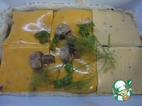 Дно формы с тестом выложить пластинками сыра, а на него начинку. Сверху накрыть оставшимися пластинками сыра и украсить грибами (по желанию). |