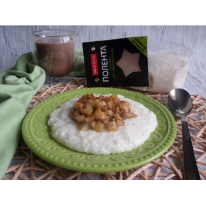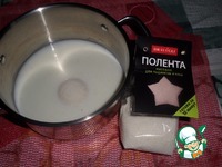 Для приготовления молочной каши я буду использовать замечательный продукт - поленту рисовую ТМ "Bravolli". Отмеряем необходимое количество рисовой поленты и добавляем в кастрюлю с молоком. |