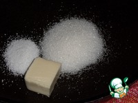 Сковороду ставим на огонь. Выкладываем в нее сахар, ванильный сахар и 20 гр. сливочного масла. |