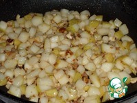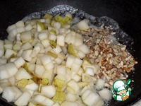 Добавляем в сковороду нарезанные груши и измельченные орехи. Перемешиваем массу. |