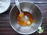 Для теста соединяю тыквенное пюре, яйцо, сахар, растительное масло. Перемешиваю до однородной массы. |