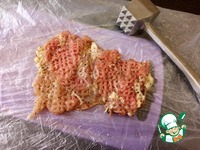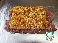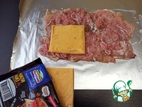 Лист фольги смазать растительным маслом. На него разложить отбитые куски куриных бёдер, формируя прямоугольник. На куриный слой разложить пластины сыра Чили Чиз ТМ Hochland. |