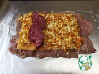 С одного края положить несколько ломтиков сырокопченой колбасы. |