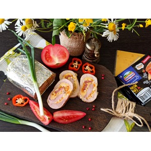 Описание: Очень вкусный рулет, островатый, с пикантной сырно-колбасной начинкой. Его с удовольствием съедят за завтраком, попробуют на званом обеде и закусят им на сытном ужине.