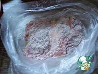 Разогреть сковороду с растительным маслом, кусок мяса запанировать в муке. |