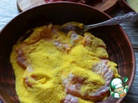 Приготовить всё для панировки : муку насыпать в пакет, смешать молоко и яйца, слегка посолить. Кукурузную поленту насыпать в широкое блюдо с бортикам и, слегка посолить. |