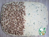 Раскатайте тесто в прямоугольник, толщиной 0,5 см. На одну половину выложите остывший фарш. |